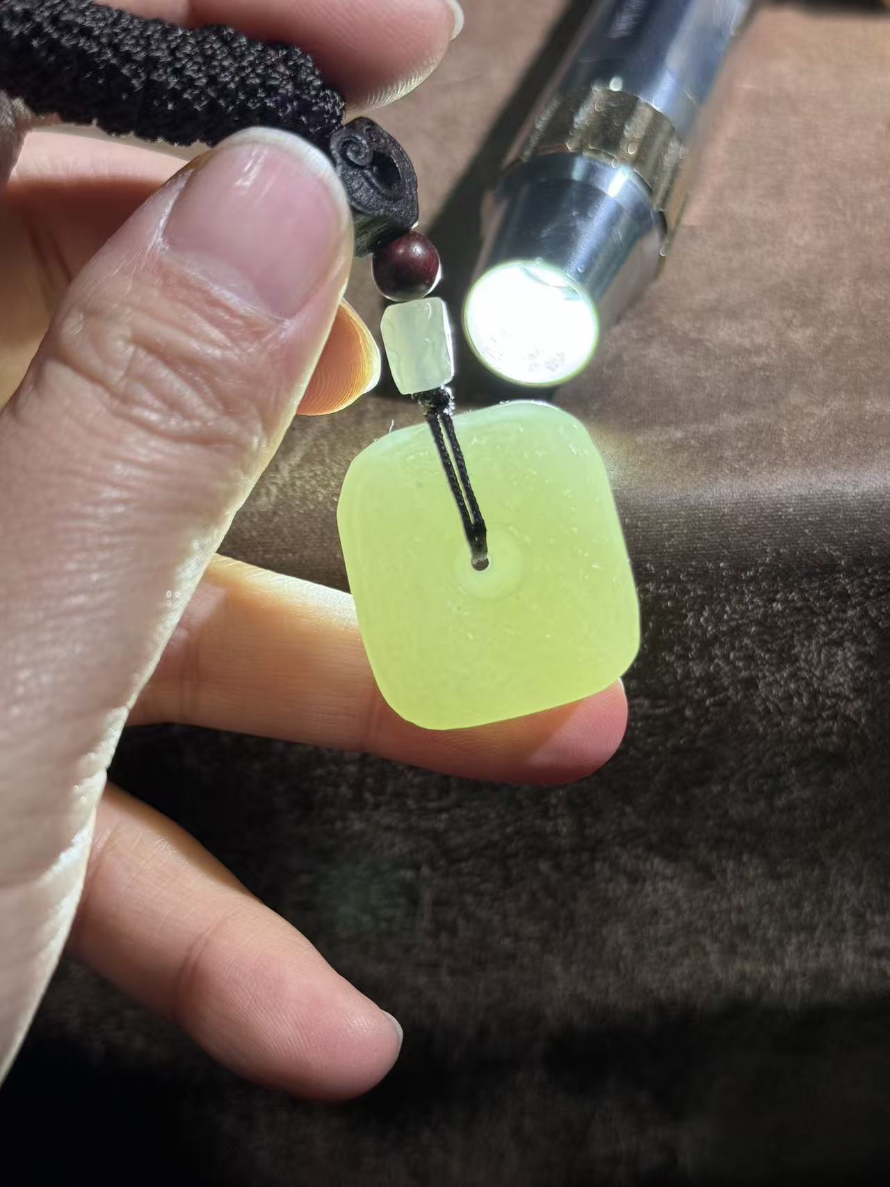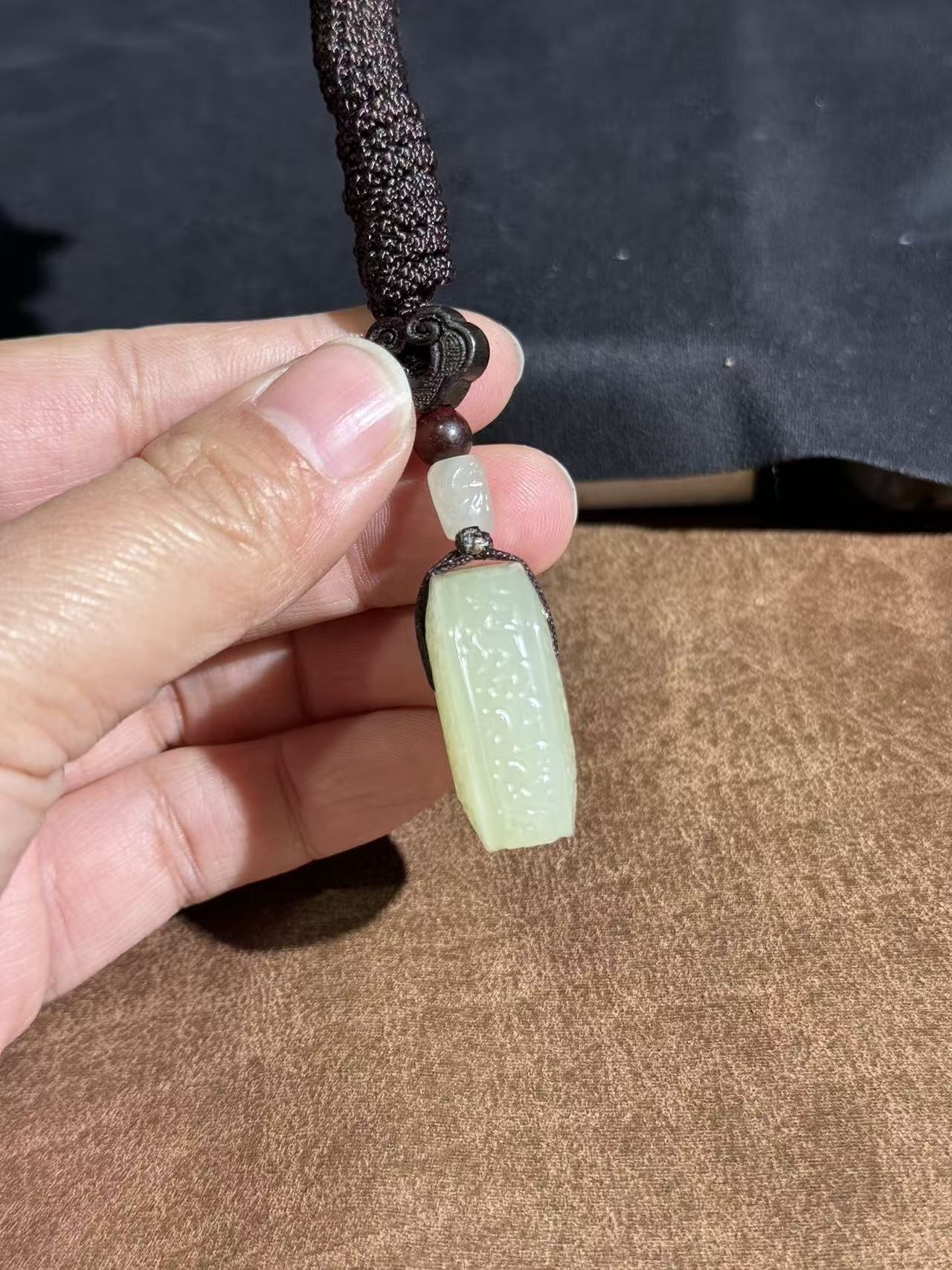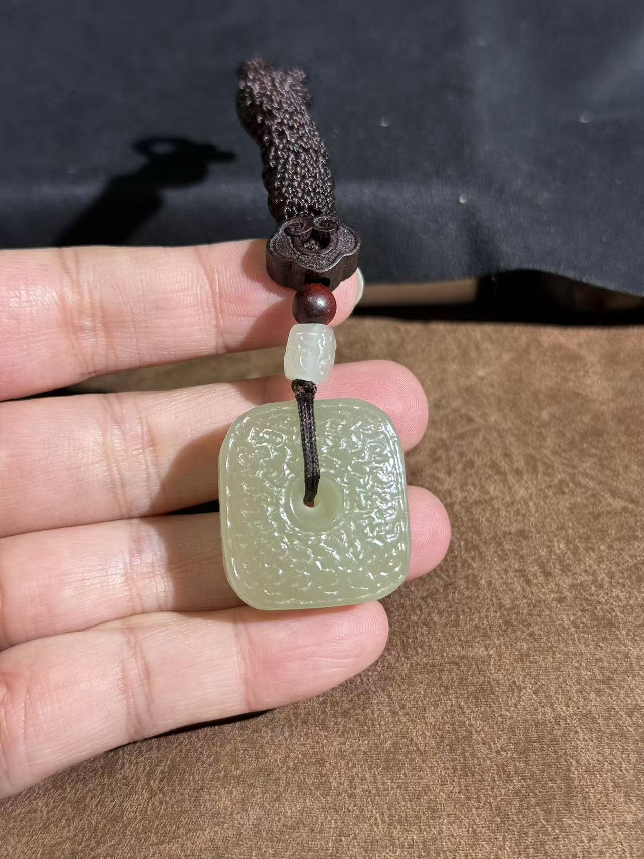 The minimalist square shape with a central hole embodies the traditional "ping an pai" (平安牌) blessing of peace and wholeness, while the subtle archaic texture adds a layer of historical depth and cultural significance. Suspended from a durable dark brown braided cord, accented with a red sandalwood bead and a matching jade bead, this piece blends ancient symbolism with understated elegance.