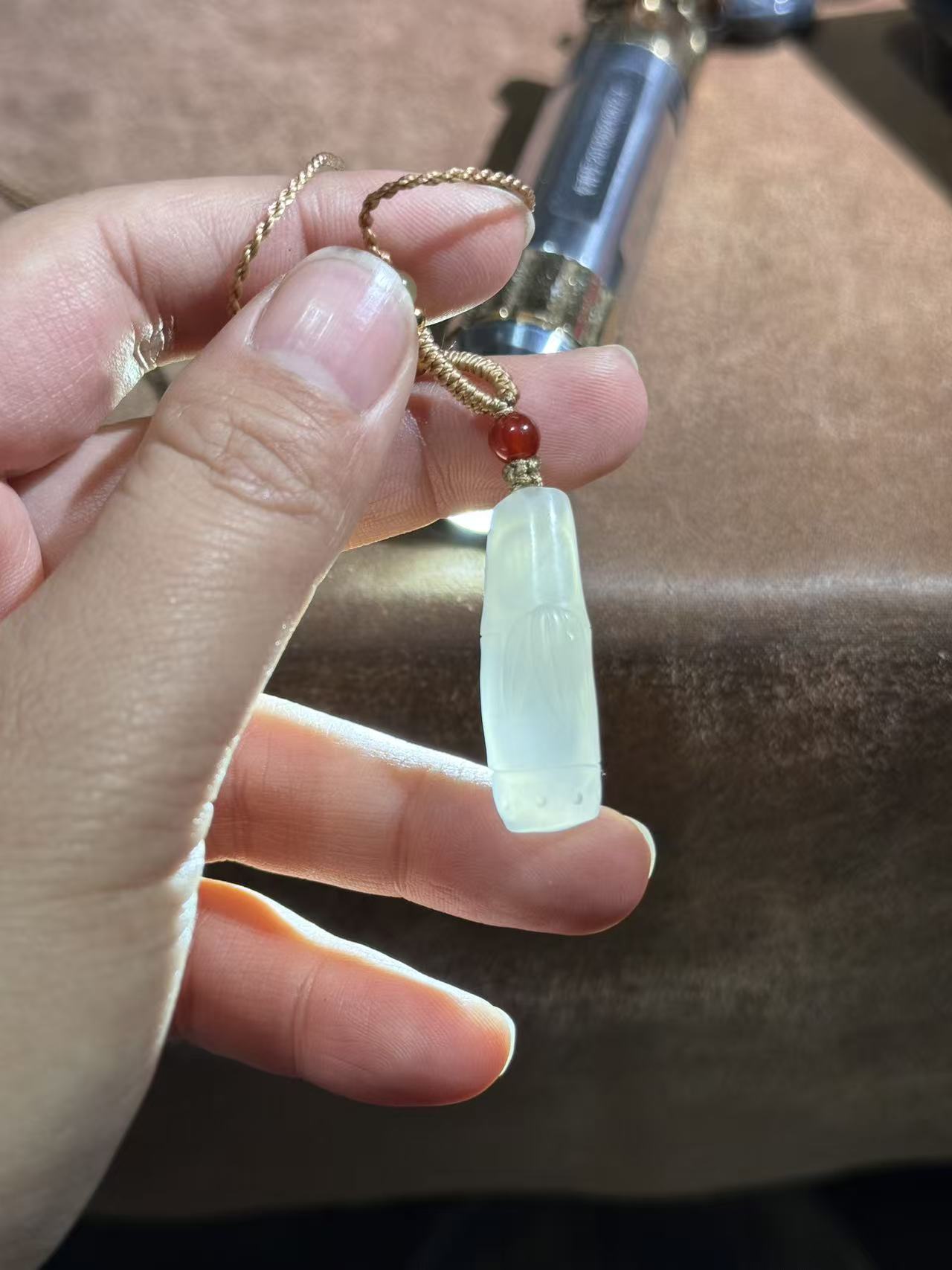 The delicate bamboo node details and leaf carvings capture the plant’s natural grace, while the warm gold braided cord and vibrant red agate bead accent add a touch of elegant contrast. This piece blends traditional symbolism with understated luxury, making it perfect for both everyday wear and special occasions like promotions or graduations.