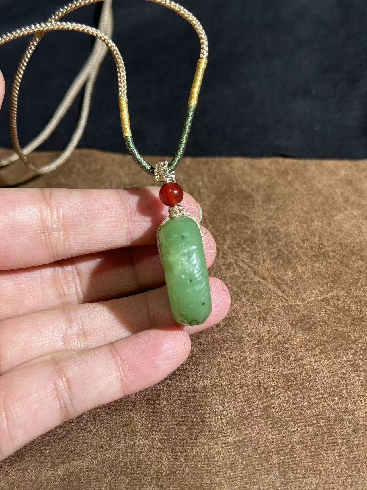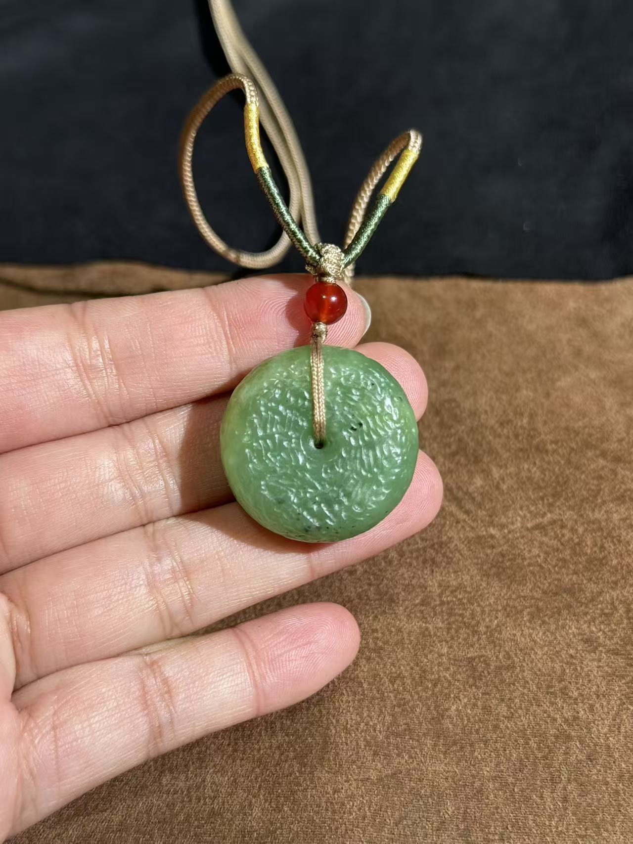 The natural apple green hue and textured surface highlight the jade’s organic beauty, while the vibrant red agate bead accent on the artisanal gold-green braided cord adds a touch of warm contrast. This piece blends traditional symbolism with understated luxury, making it perfect for both everyday wear and special occasions.